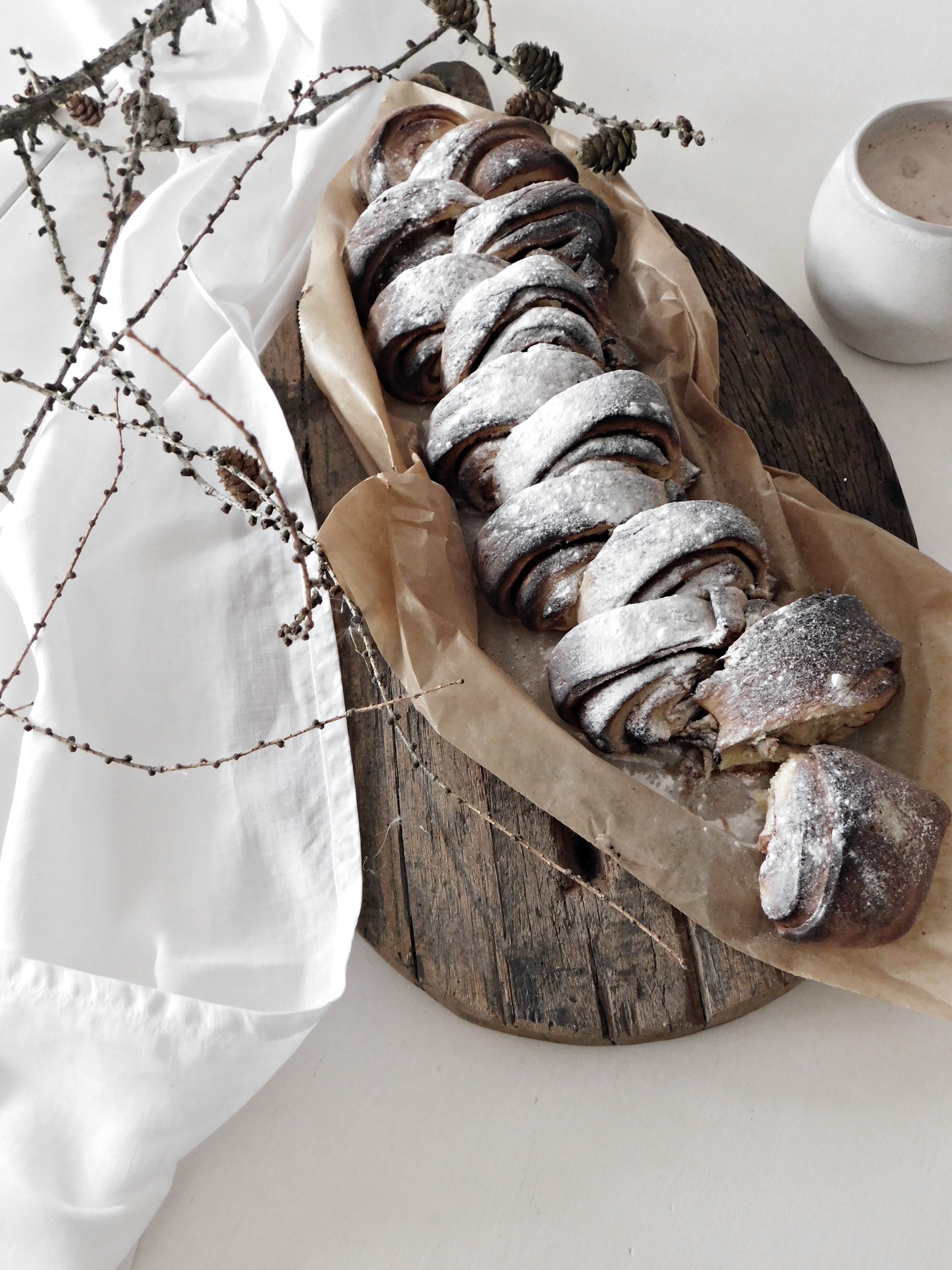 Das Grundrezept von dem Nutella Zopf findest du hier. Nach dem Ausrollen habe ich den Teig dünn mit Nutella bestrichen und aufgerollt. Mit der Küchenschere habe ich oben in die Rolle alle paar Zentimeter eingeschnitten und die so entstandenen Stücke abwechselnd nach außen gebogen, alles mit flüssiger Butter bestrichen und im Ofen gebacken.